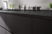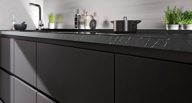 Façades noires, corps graphite et plan de travail Carrara noir - pour mettre en valeur aujourd’hui une cuisine sans poignée et lui donner le rôle principal.