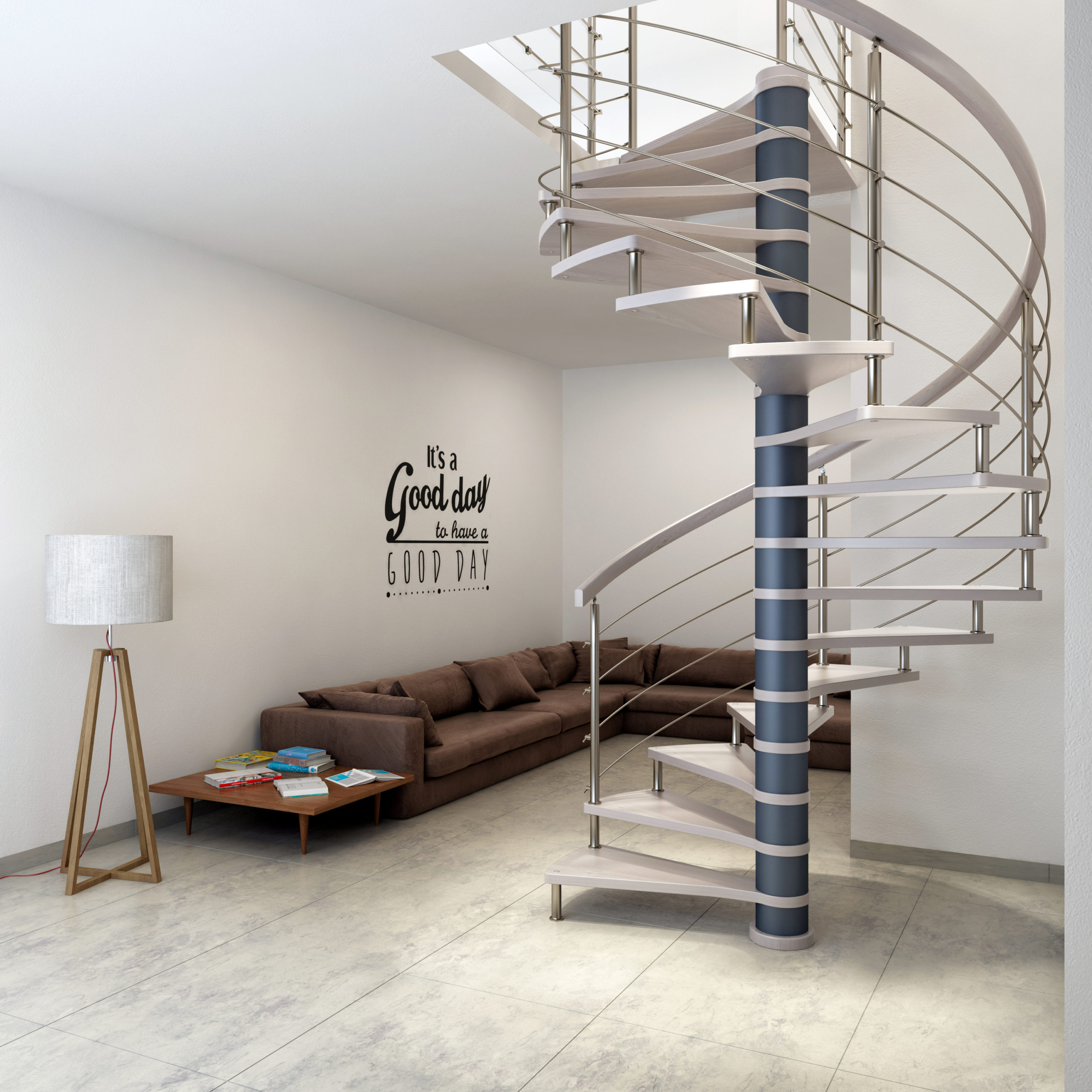 Escalier hélicoïdal avec fût central thermolaqué et marche en bois.