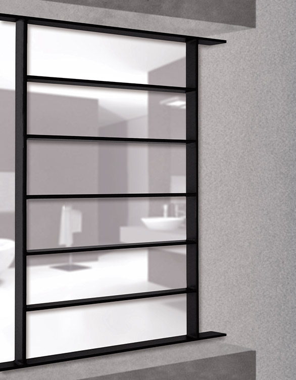 La grille de défense baguée est composée de traverses en fer plates de 35 x 8 avec un barreaudage fer plates de 35 x 8. L'assemblage des barreaux et l'encadrement se trouve au même niveau.