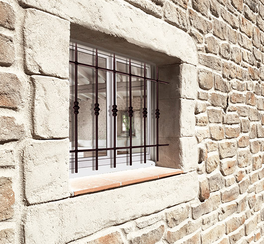 La grille de défense Marine est composée de traverses en fer plates 30 x 8 avec un barreaudage rond plein de 14 avec des bagues et des barreaux appointés.