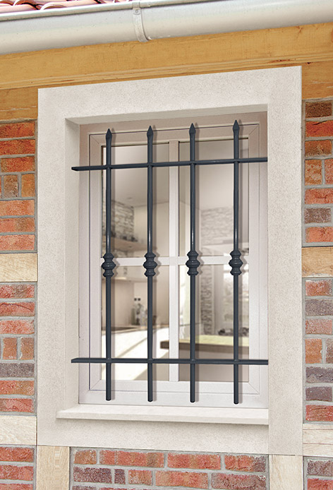 La grille de défense Royale est composée de traverses en fer plates 30 x 8 avec un barreaudage tube de 14 avec bagues et pointes.