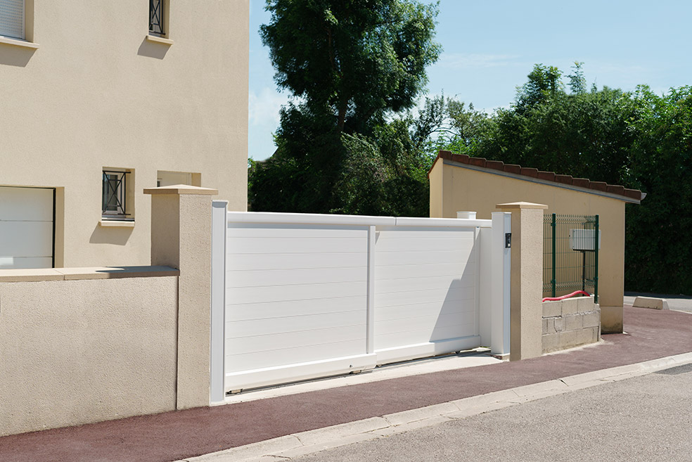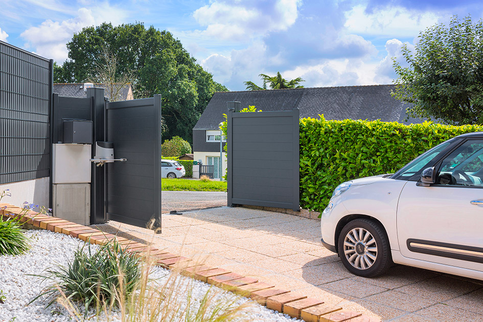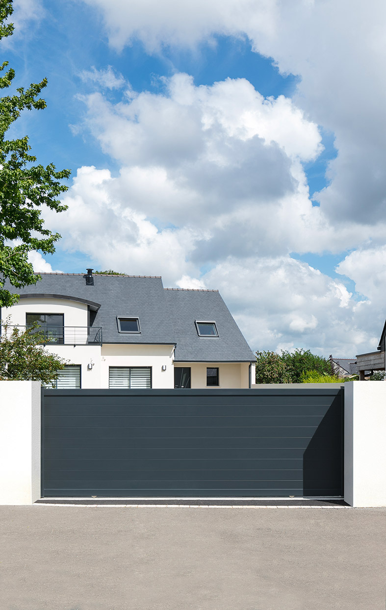 Description Le portail Anaé est l'alliance de la modernité par sa couleur monochrome et du confort car il s'adapte à tous les types de terrain.