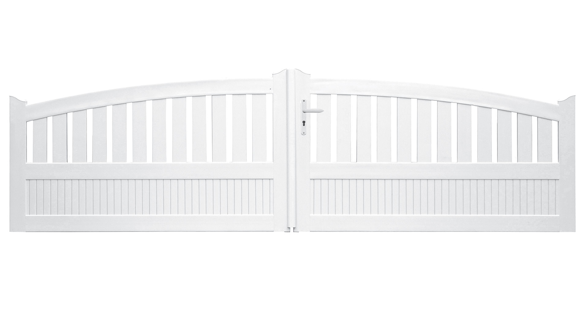 Description Ce portail est unique par sa composition avec la différence entre la partie supérieure et inférieure et les lames ajourées contre le lambris plein.