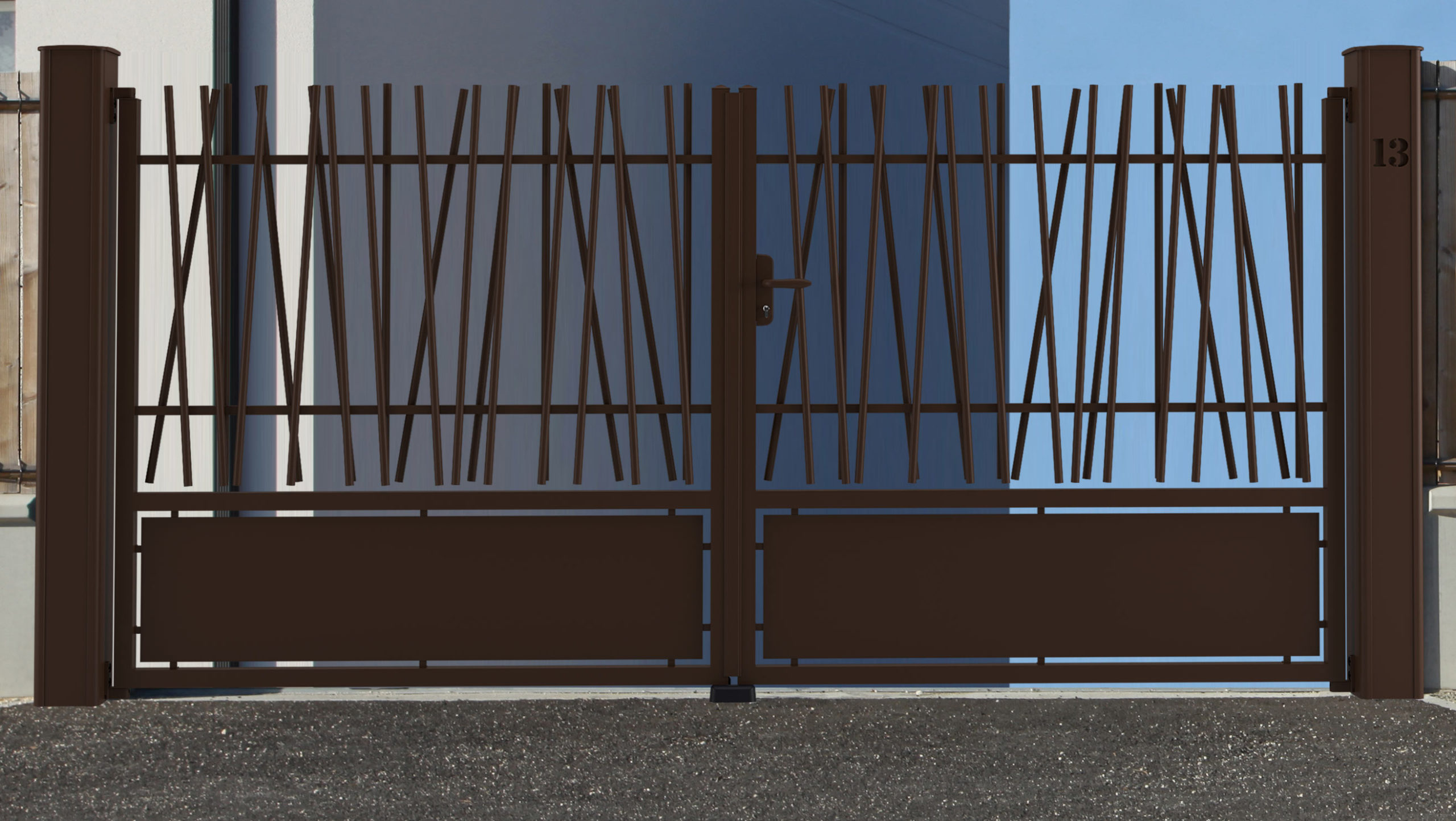 Description Le portail Dreuz est inspiré de la nature par son design boisé mais revisité avec un soubassement plein.