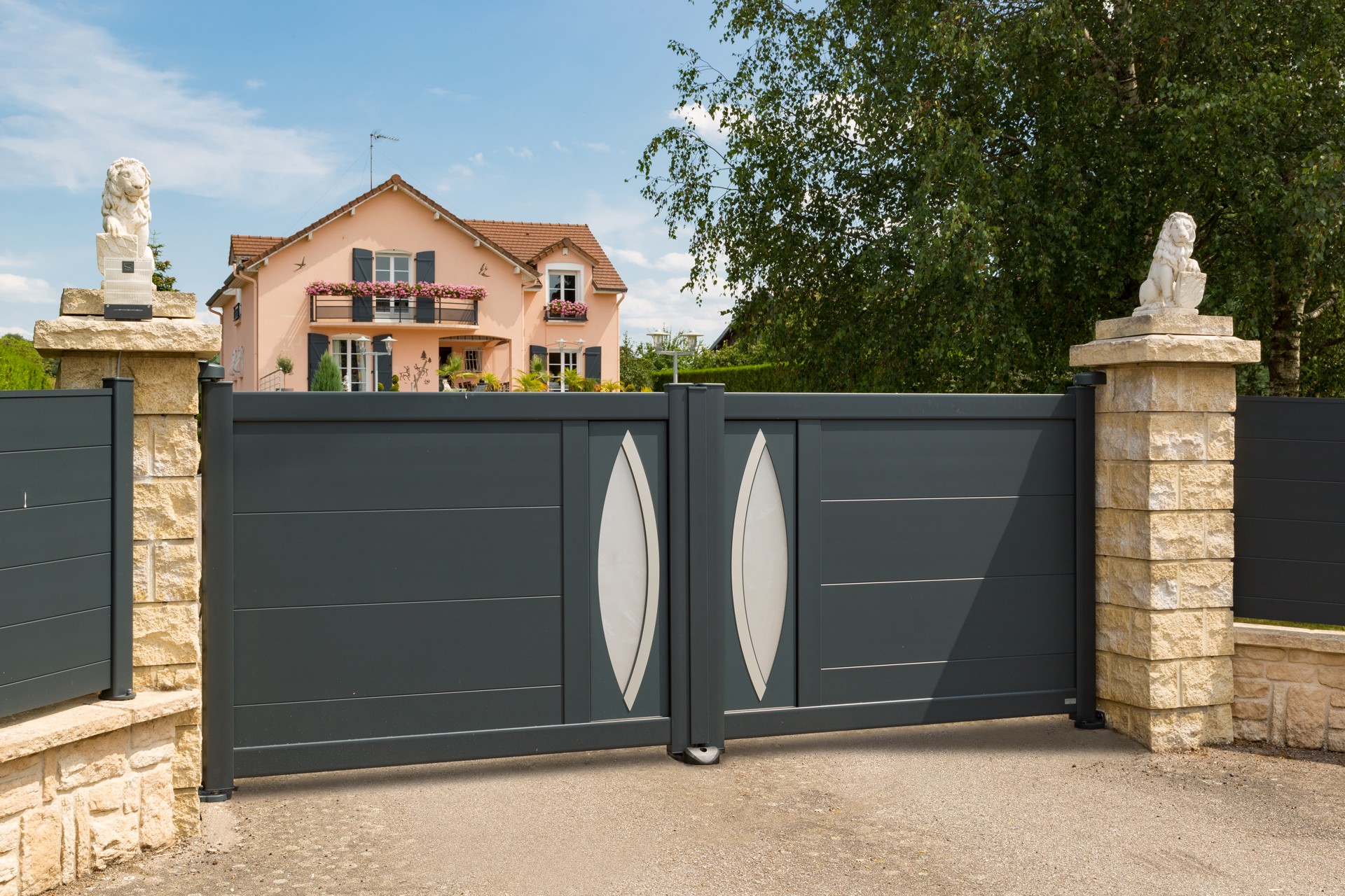 Le portail Sell est composé de tôles découpées au laser avec verre opale et d'un décor en aluminium brossé et anodisé.