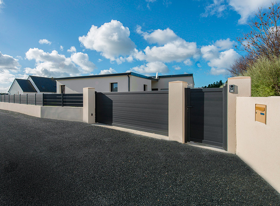 Le décor circulaire du portail Armel contraste avec les lignes verticales des lames qui le compose.