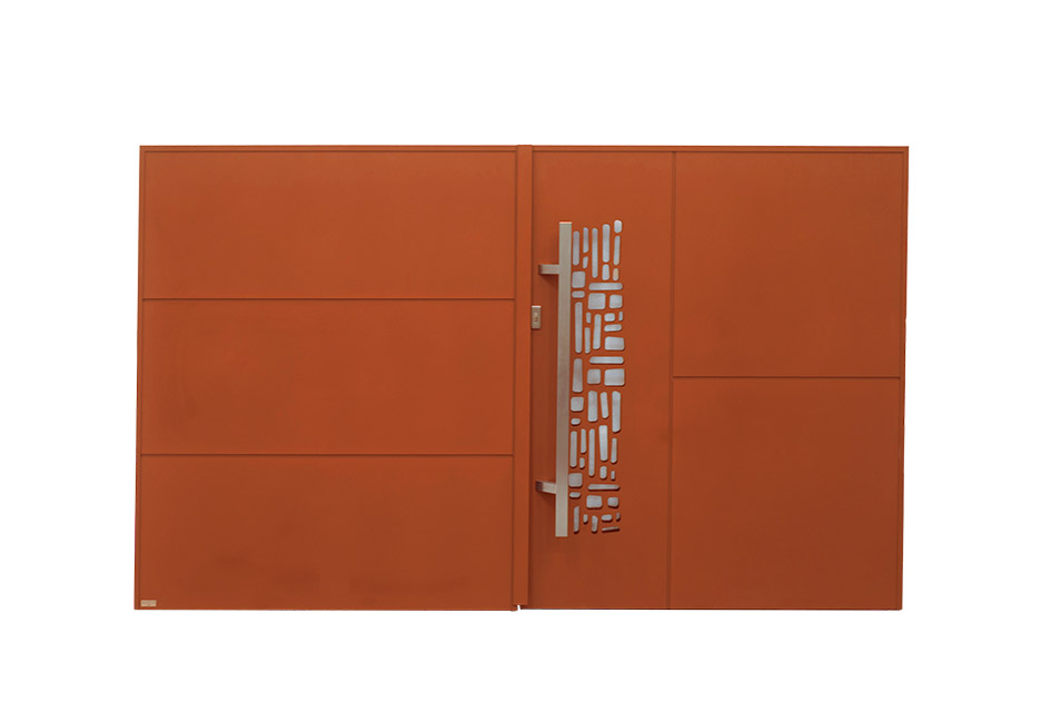 Le portail Lug est contemporain par son design mais et est adouci par son motif avec une découpe au laser au niveau de la serrure. Il reste pour autant très géométrique.
