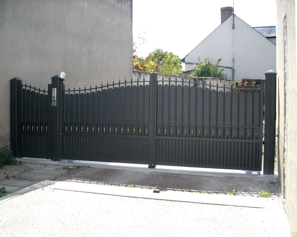 La forme de la structure du portail Rosnoen est en chapeau de gendarme renforcée ses tubes verticaux et ses piques présents sur la partie haute du portail et un bandeau central.