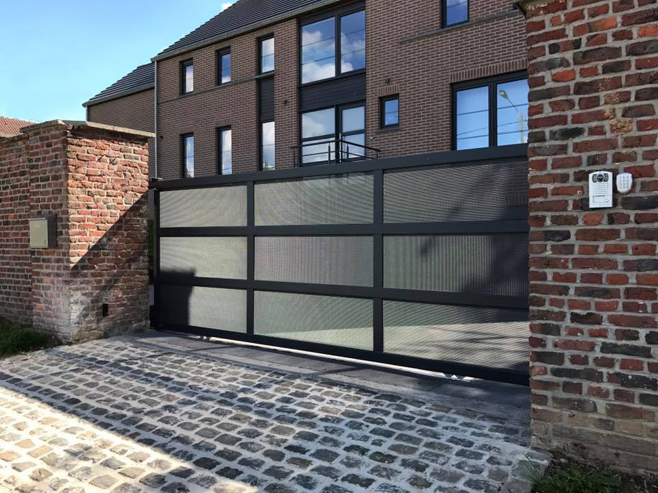 Le remplissage en tôles perforées rondes fait ressortir le côté industriel du portail Tor. Ce portail joue avec la lumière et la transparence assurant une intimité et un flux de lumière.