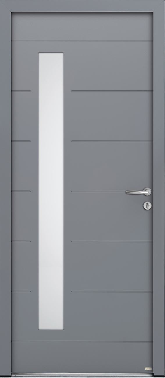 La porte d'entrée Albe est composée de traits en reliefs horizontaux et un pan vitré vertical.