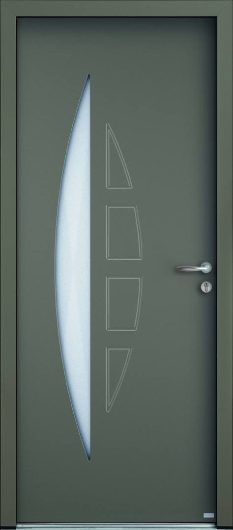 Le design de la porte d'entrée Alcyone est divisé en deux parties, l'une d'un vitrage en arc de cercle et l'autre un arc de cercle divisé en quatre parties en insert.