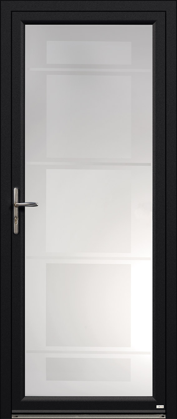 La porte d'entrée vitrée Candel 28 est composée d'un vitrage sablé avec formes rectangulaires recouvrant l'ensemble du vantail.