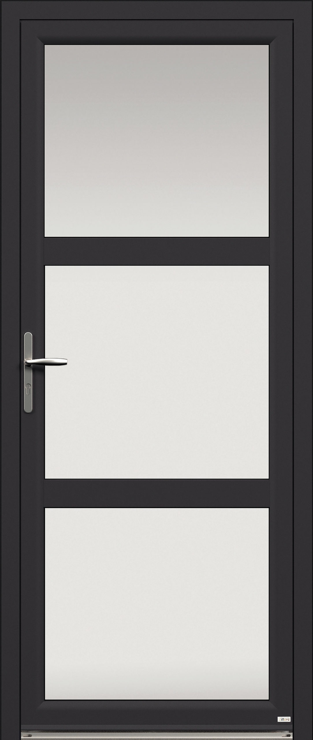 Le triptyque de la porte d'entrée vitrée Candel 58 fait ressortir le côté contemporain de son vantail. La pièce l'accueillant est traversée partiellement par la lumière du jour.
