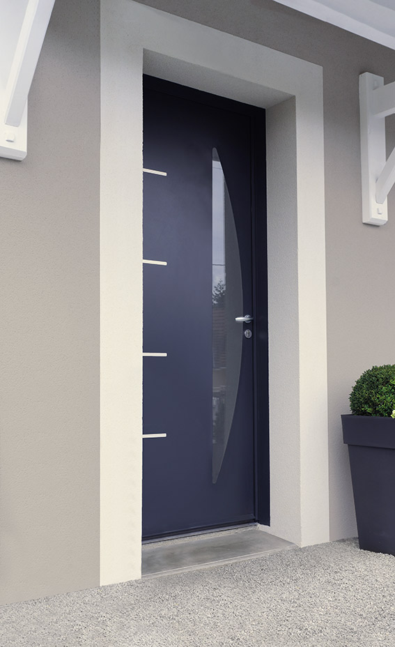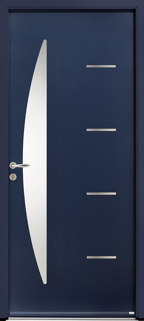 Le vitrage de la porte d'entrée Cedousa 20 représente une demi-lune pleine en direction de la serrure, venant complétée une répétition de quatre décor en inox vertical aux bonds arrondis.