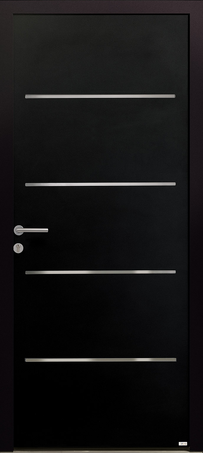 La porte d'entrée Cotim 11 jouit d'un design contemporain sur son vantail. Mais il est possible de l'harmoniser avec la porte de garage designée par Soprofen et par le portail de clôture Horizal.