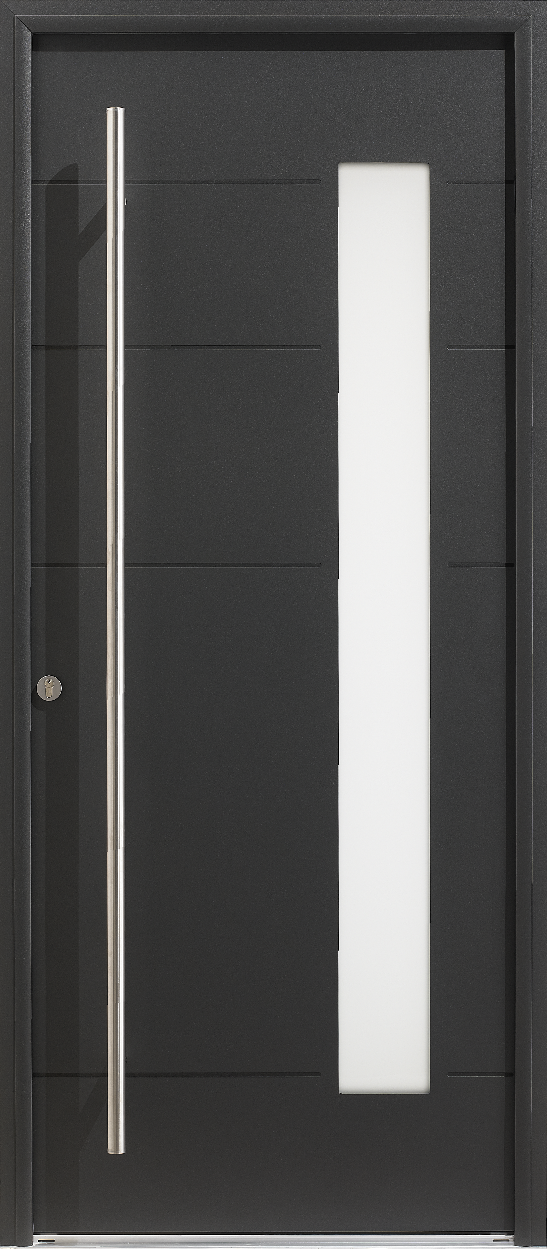 Le design de la porte d'entrée Cotim 22 duo est graphique entre les rainures verticales et le vitrage avec la barre de tirage horizontaux. La clé est nécessaire pour ouvrir la porte de l'extérieur.