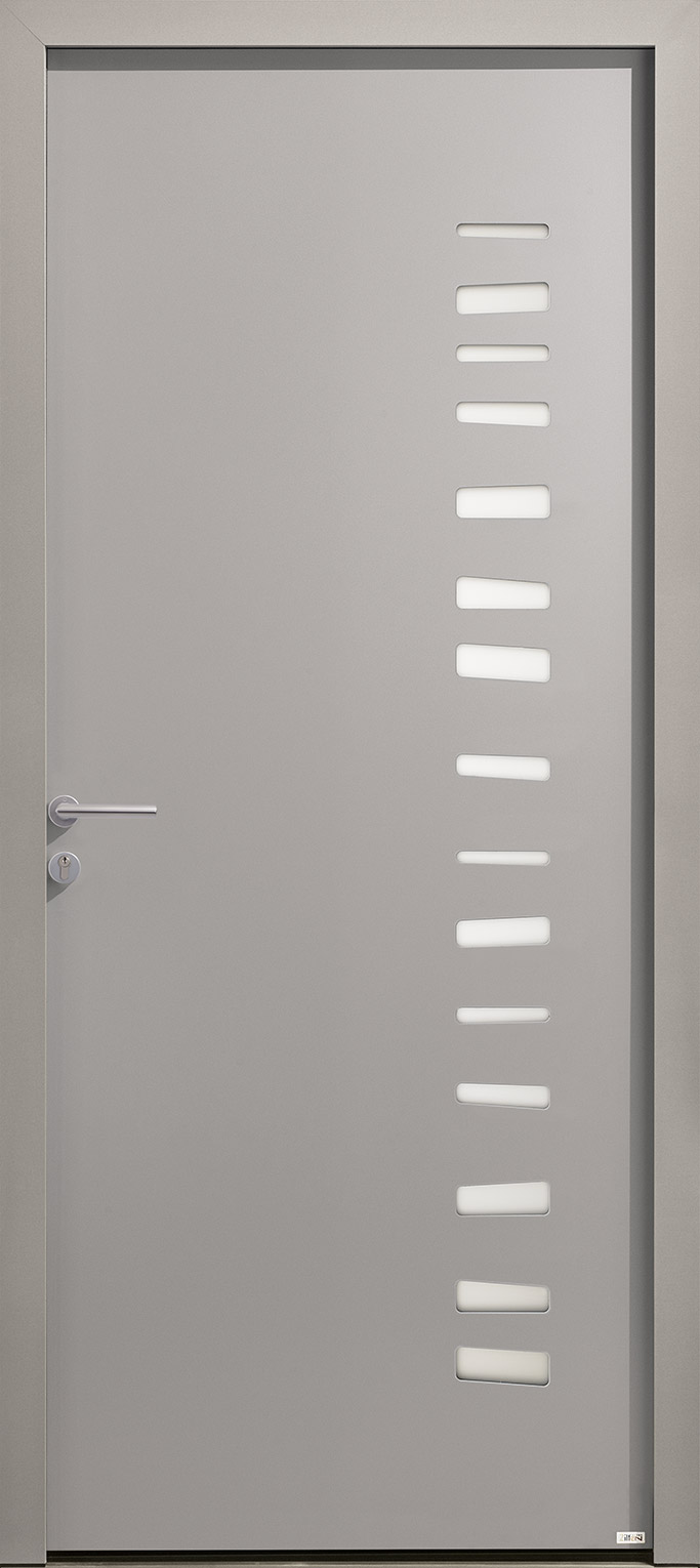 La porte d'entrée Crypto-15 est décorée par un vitrage découpé en petits rectangles alignés sur le partie extérieure du vantail.