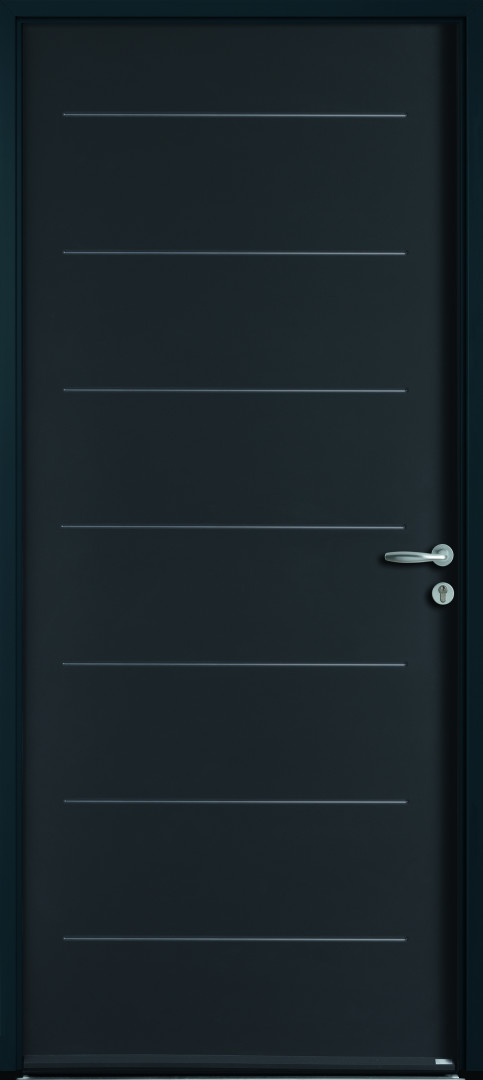 La porte d'entrée Equation dispose d'un design épuré par des inserts horizontaux. Ce design peut être coordonné avec la porte de garage signé Novoferm qui s'en est inspiré.