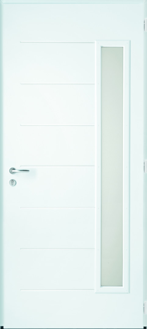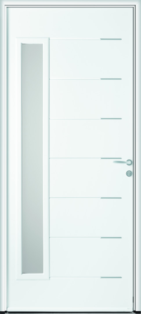 Le design de la porte d'entrée Feel est disponible à la fois en version Evo avec un vitrage affleurant mais aussi avec des encadrements PVC ou en aluminium.