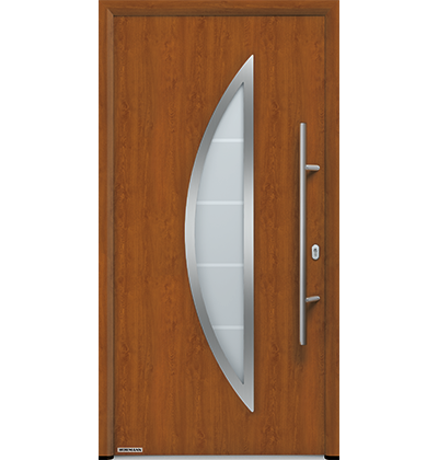 Poignée en acier inoxydable HB 38-2 sur panneau acier, avec vitrage arrondi : triple vitrage isolant, extérieur verre de sécurité feuilleté, milieu Float sablé avec bandes transparentes, intérieur verre de sécurité trempé, transparent, valeur UD jusqu'à 1,2 W/ (m²·K)*