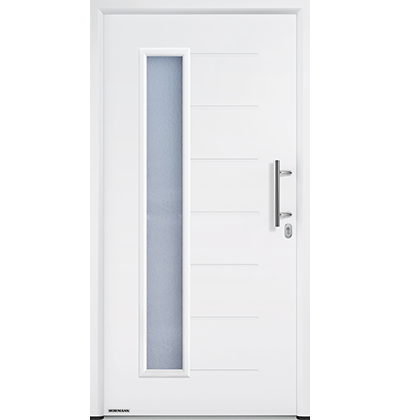 Poignée en acier inoxydable HB 14-2 sur panneau acier, en option avec parements en aspect acier inoxydable, vitrage continu : double vitrage isolant, extérieur verre de sécurité feuilleté, intérieur verre de sécurité trempé, Mastercarré, valeur UD jusqu'à 1,4 W/ (m²·K)*