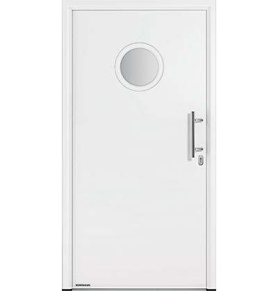 Poignée en acier inoxydable HB 14-2 sur panneau acier, avec hublot Ø 300 mm : double vitrage isolant, extérieur verre de sécurité feuilleté, intérieur verre de sécurité trempé, verre décoratif 504, valeur UD jusqu'à 1,2 W/ (m²·K)*