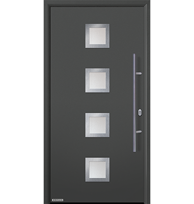 Poignée en acier inoxydable HB 38-2 sur panneau acier, 4 vitrages carrés avec cadre en acier inoxydable : triple vitrage isolant, extérieur verre de sécurité feuilleté, milieu Float sablé, intérieur verre de sécurité feuilleté, transparent, valeur UD jusqu'à 0,93 W/ (m²·K)*