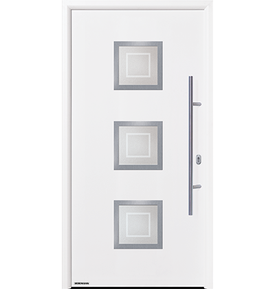 Poignée en acier inoxydable HB 38-2 sur panneau acier, 3 vitrages carrés avec parement carré transparent et cadre en acier inoxydable : triple vitrage isolant, extérieur verre de sécurité feuilleté, milieu Float sablé, intérieur verre de sécurité trempé, transparent, valeur UD jusqu'à 0,99 W/ (m²·K)*