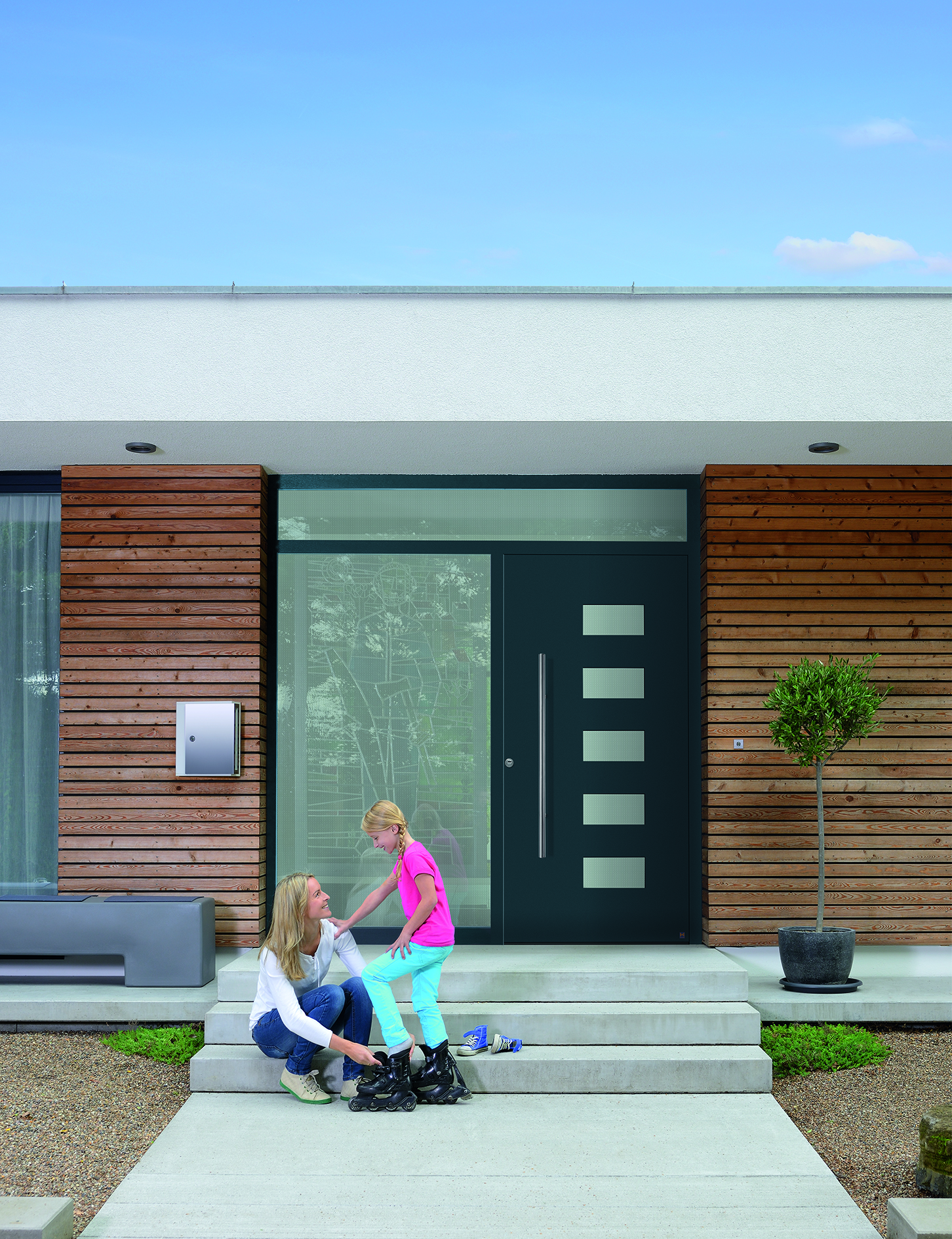 La porte d'entrée peut être accompagnée d'une partie latérale avec ou sans panneau à motif et/ou d'une imposte vitrée
