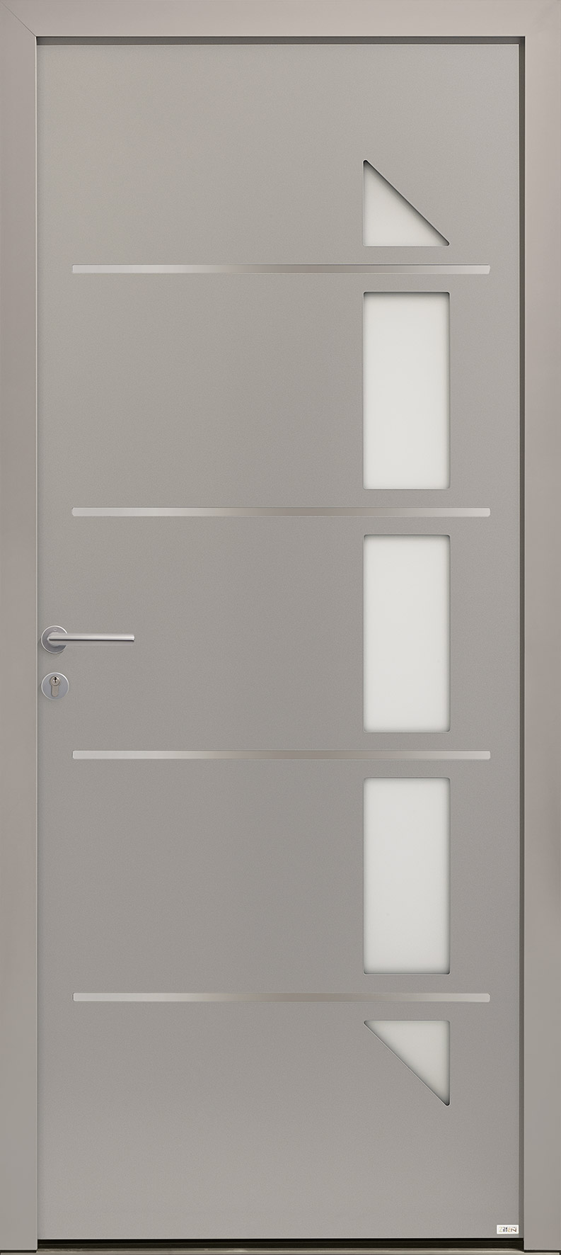 La porte d'entrée Glam jouit d'un design symétrique et alterné entre un vitrage triangulaire, un décor effet miroir et un vitrage rectangulaire.