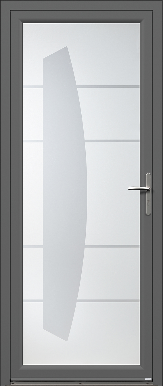 Le vitrage qui recouve l'ensemble du vantail de la porte d'entrée Kamy superpose deux matières différentes et faisant apparaître des lignes verticales.