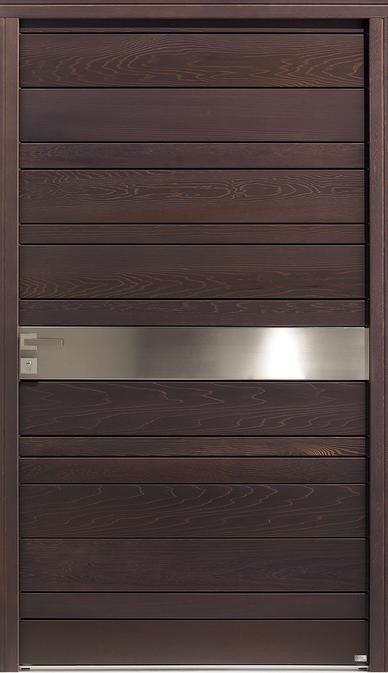 La porte d'entrée Nativ 8 associe le charme du bois rainuré et la modernité du bandeau inox au centre la porte.