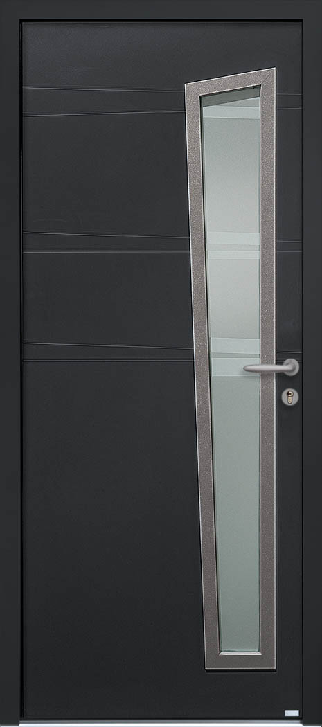La porte d'entrée Opale est composée de trois fois deux rainures horizontaux et d'un vitrage vertical renforcé par une bande aluminium. Le design de la porte d'entrée se décline avec le portail et la porte de garage.
