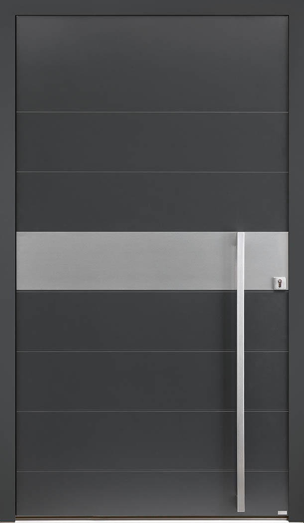 Le décor de la porte d'entrée Oxygène est composé de rainures et d'inserts horizontaux venant contraster avec la barre de tirage semi-exclusive verticale.
