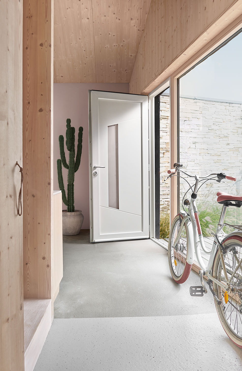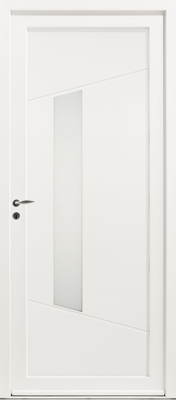 Le design de la porte d'entrée est identique entre les faces intérieures et extérieures avec la présence de rainures de part et d'autre du décor inox.