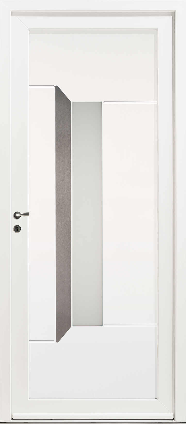 Le décor de la porte d'entrée Kellys 6 donne l'illusion de profondeur avec la juxtaposition du décor ton inox.