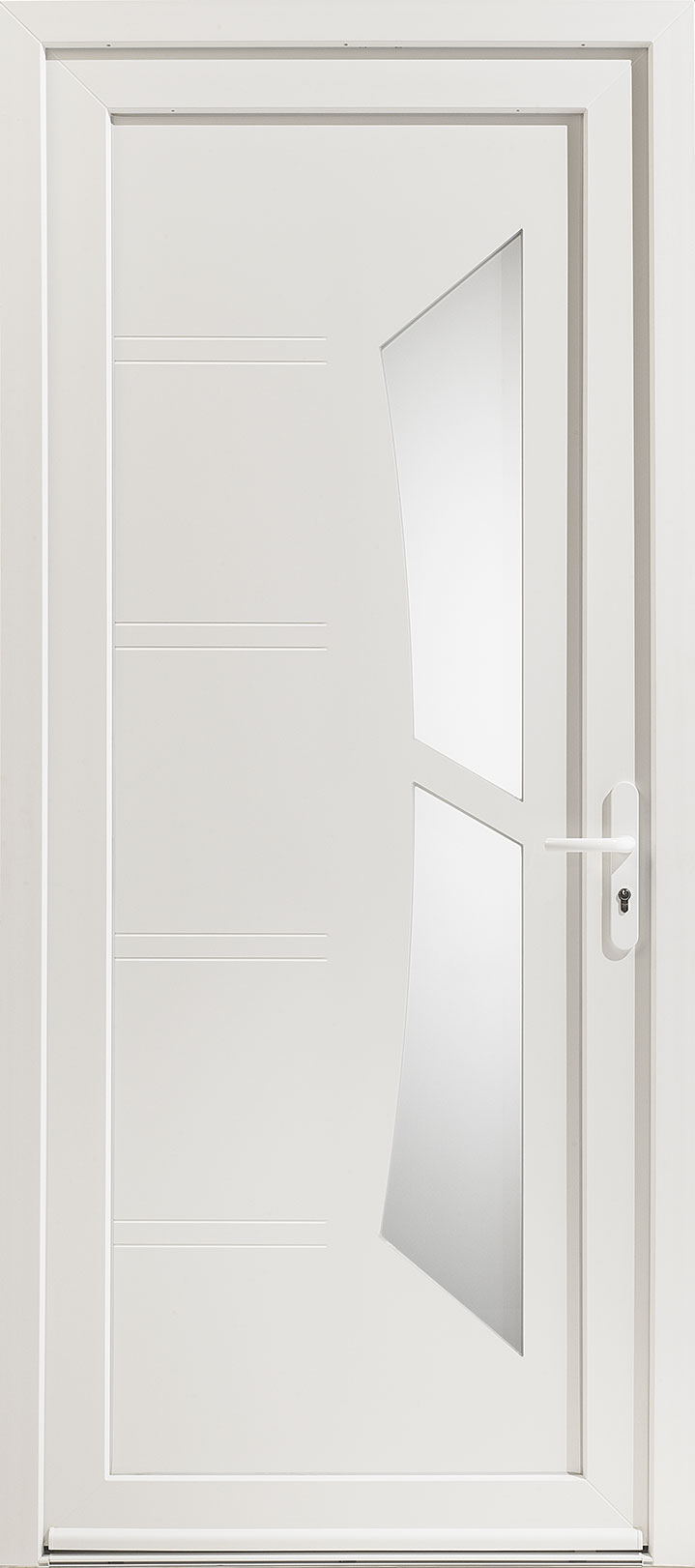 Le design de la porte d'entrée Milky 1 dispose d'un vitrage feuilleté sablé avec en option la possibilité d'un décor ton inox sur les deux faces de la porte.
