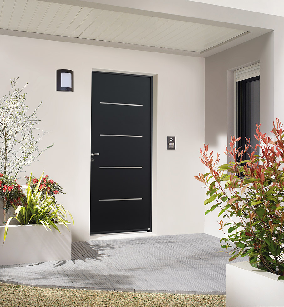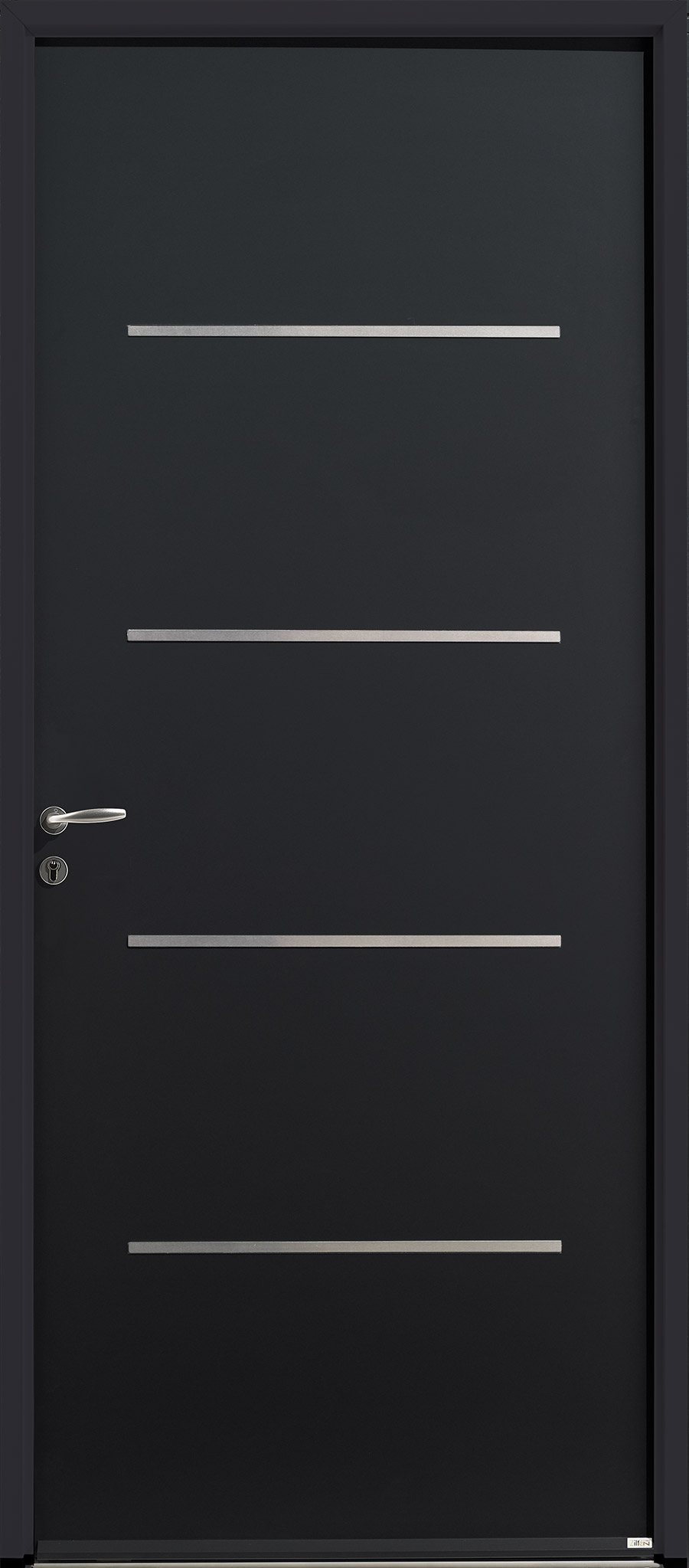 La porte d'entrée Saori est composée d'un décor linéaire fin et plein en inox répété à quatre reprises de façon identique et centrée.