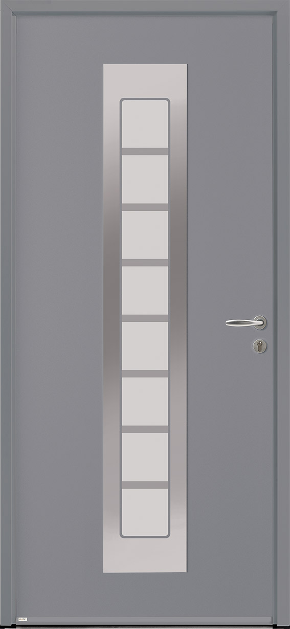 Le vitrage de la porte d'entrée Silk dispose de lignes horizontales et le tout renforcé par une bande en acier.