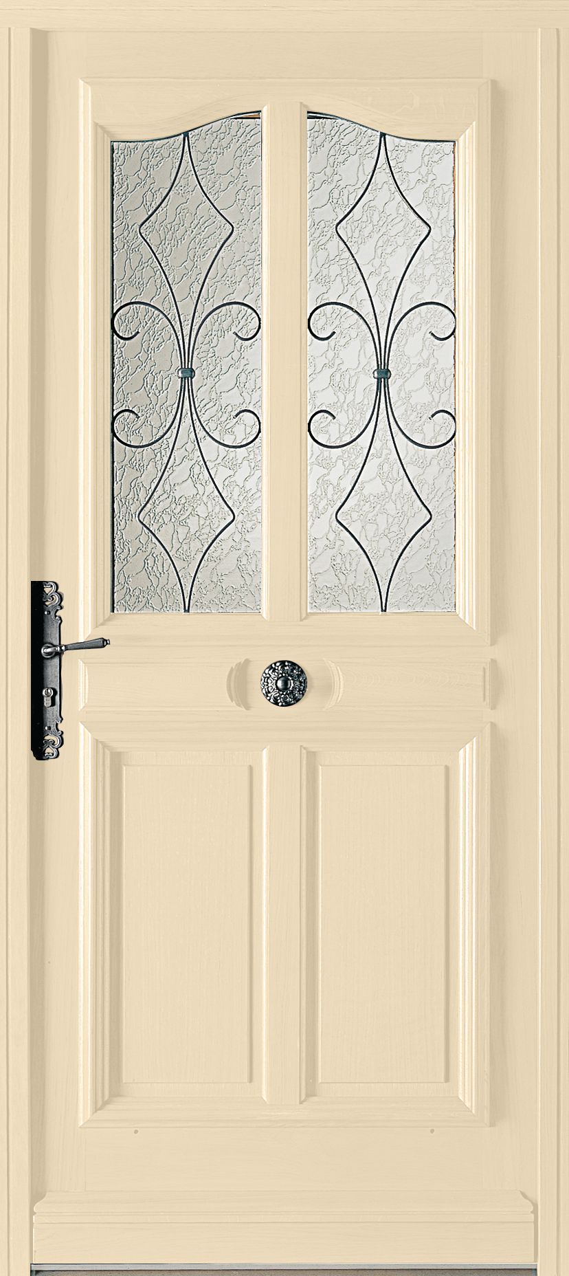 L'ensemble du décor de la porte d'entrée Argenteuil est mise en avant et donne donc de la profondeur à la porte. Elle est constituée de deux vitraux et des grilles sur la face extérieure de la porte, d'un bouton central et d'un soubassement soutenu par deux moulures en bois.