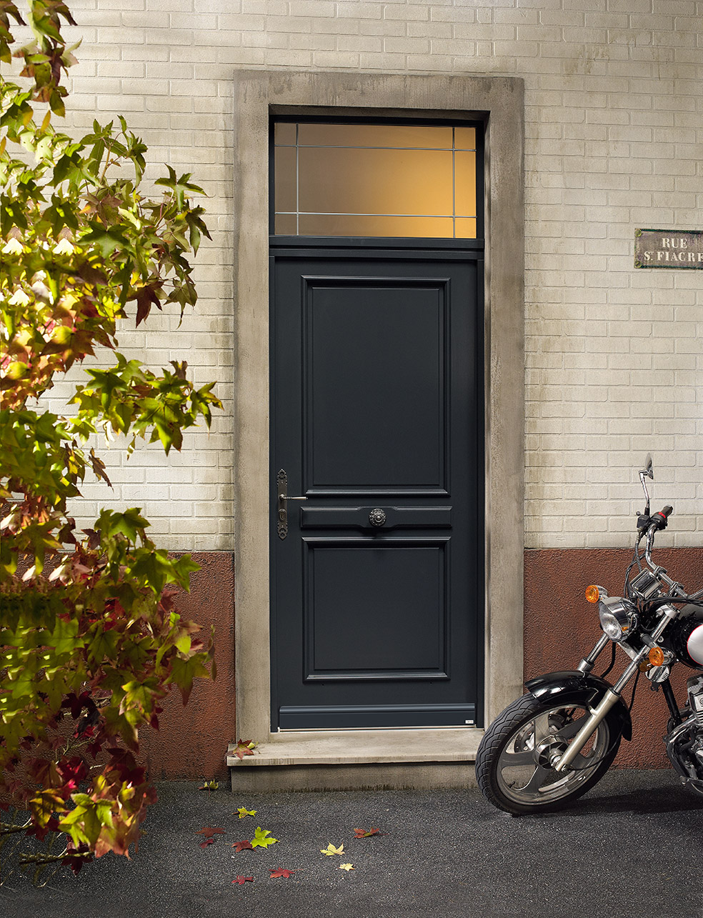 La porte d'entrée Chalons est une âme pleine avec un bouton central et des moulures en bois disponible sur les faces intérieures et extérieures.