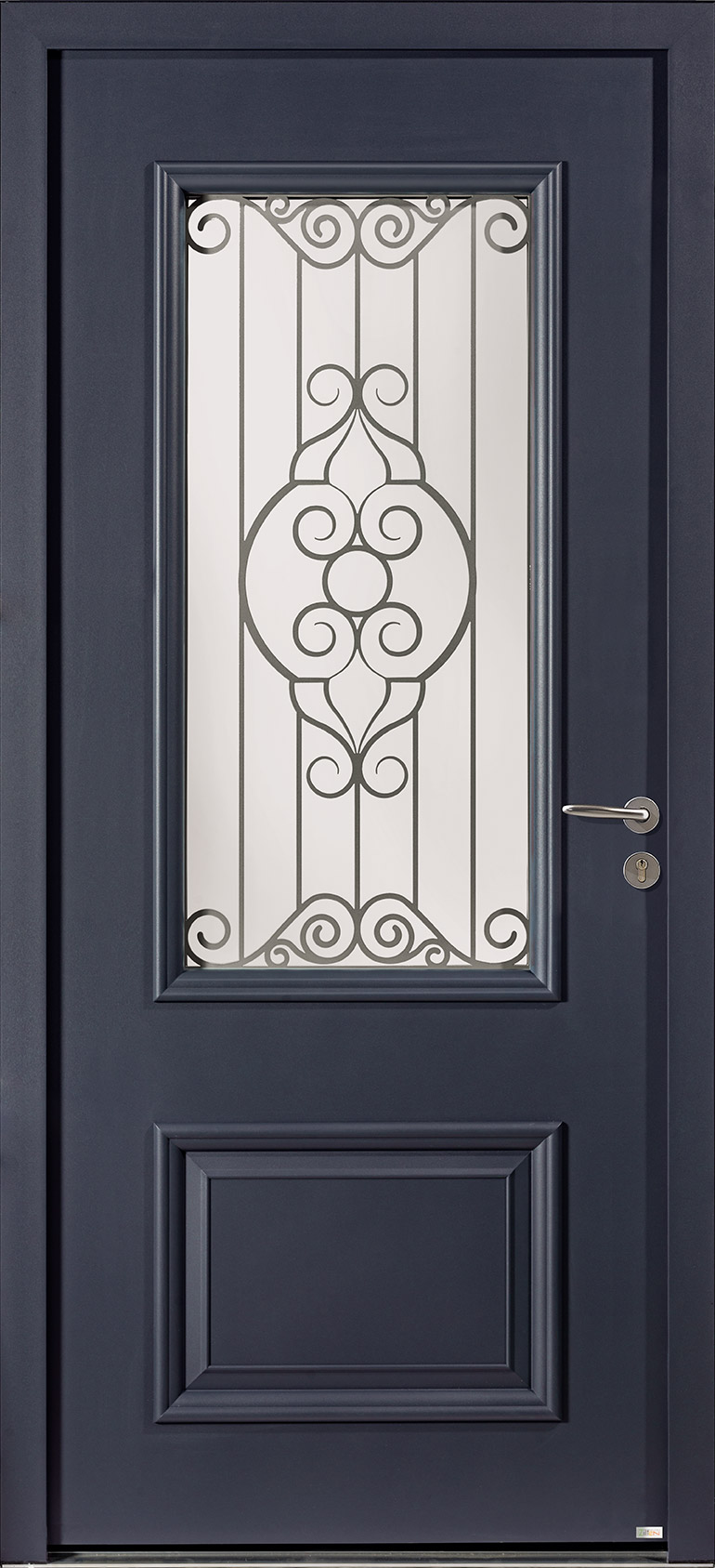 Le design de la porte d'entrée Cordey 1 est classique par son ferrage aux lignes harmonieuses insérées entre deux vitraux.