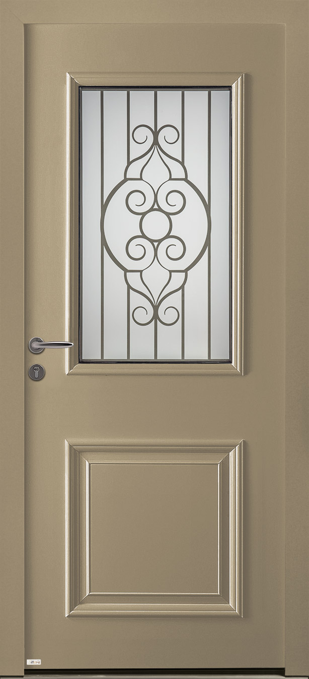 Le vantail de la porte d'entrée Cordey 2 est divisé d'un vitrage avec une sérigraphie grise uniquement pour la partie supérieure et d'un âme pleine sur la partie inférieure.