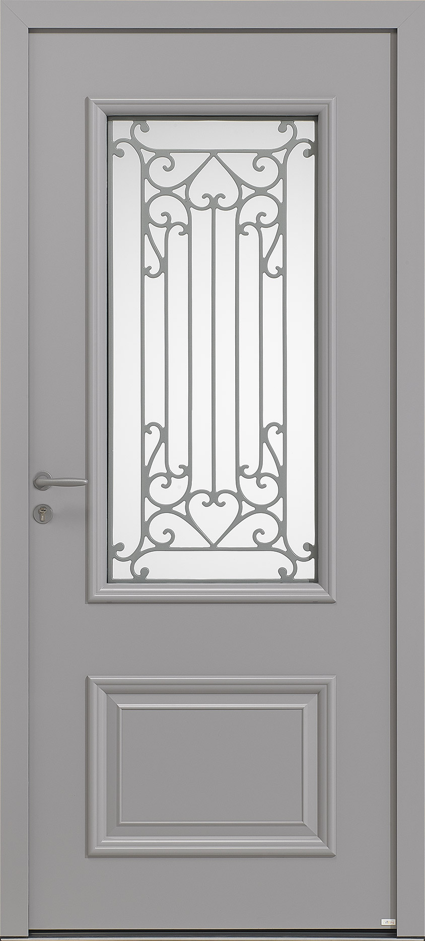 La porte d'entrée Cormelles en aluminium est classique par le design de la sérigraphie du vitrage qui recouvre la partie supérieure du vantail.