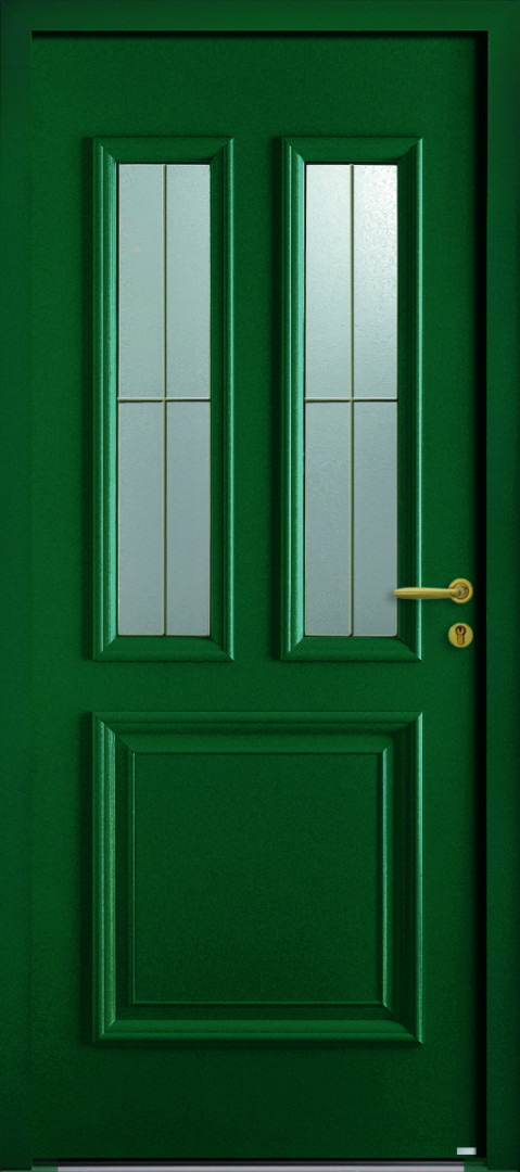 Le design de la porte d'entrée Flavie est divisé en deux parties. La partie haute avec deux vitraux et la partie basse est en plein.