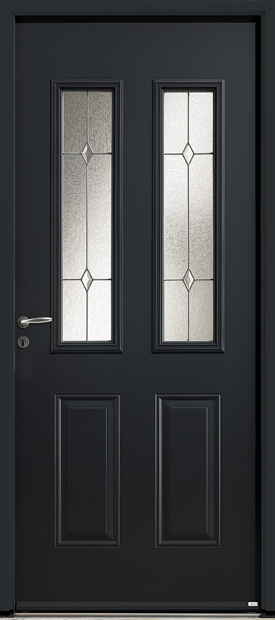 La porte d'entrée Galena est divisée en deux parties d'un soubassement plein avec deux moulures rectangulaires et de deux vitraux quadrillés se coupant en formant de losange.