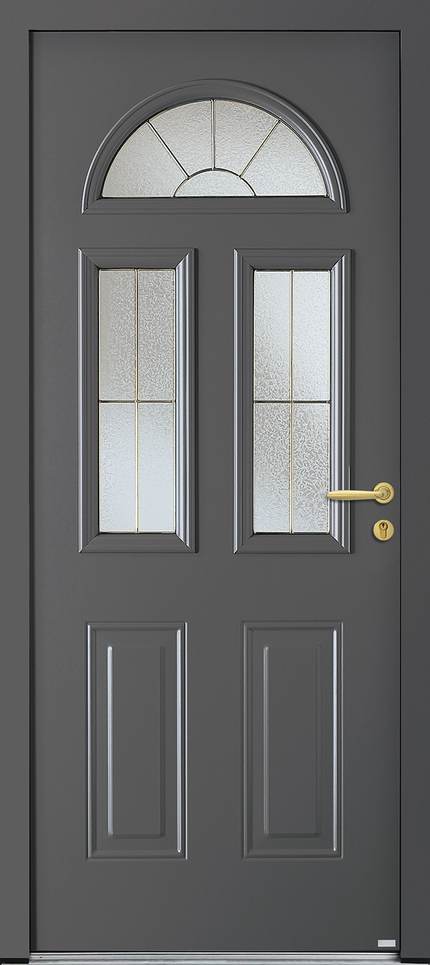 La porte d'entrée Gaspésie est composée de trois vitraux, l'un cintré sur la partie supérieure de la porte et deux rectangulaires s'opposant.