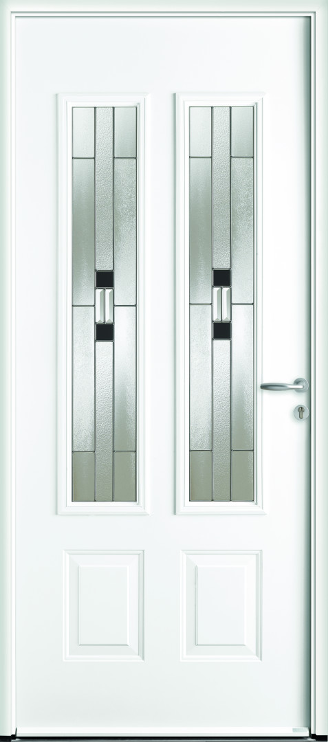 La porte d'entrée Kalea soutient son esthétisme avec des lignes art déco centrées dans un vitrage sablé.