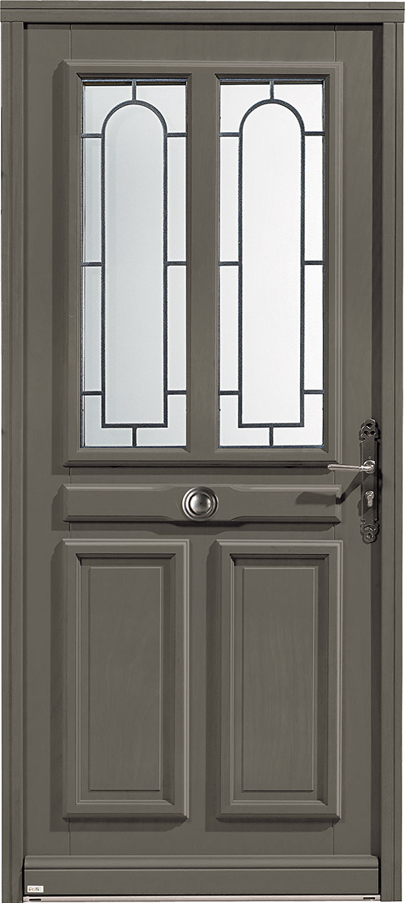 La porte d'entrée Lunel comporte un châssis ouvrant et les grilles sont présentes sur la face extérieure de la porte.