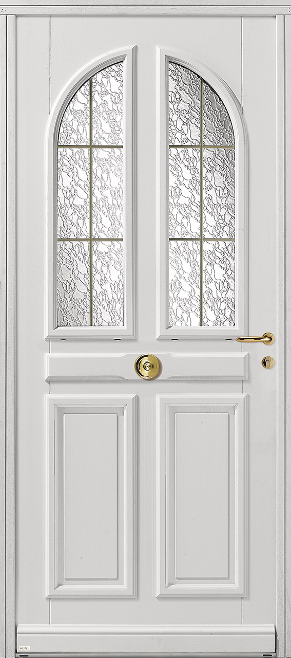 Le design de la porte d'entrée Manosque est classique par la présence du vitrage cintré quadrillé et imprimé. Les moulures et le bouton central renforce ce style.